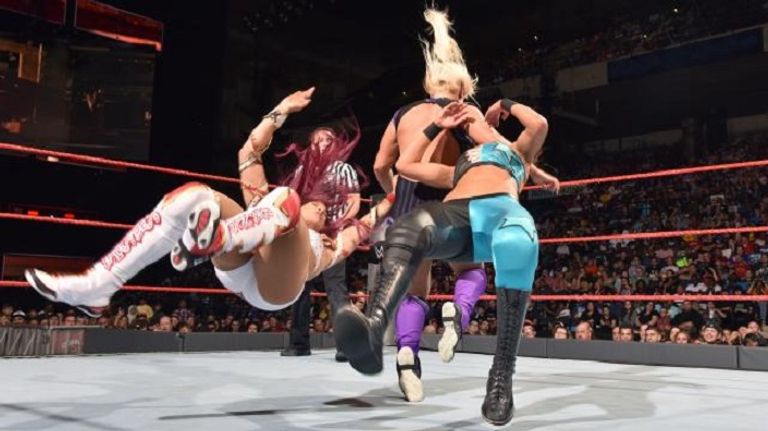 بدأ النزال بحماس من دانا بروك التي ضربت بايلي وأخرجتها من الحلبة، ثم قامت بضرب ساشا بانكس التي ردت الضربات لها وأوقفتها في ركن الحلبة وواصلت ضربها وحاولت تثبيت أكتافها لكن دانا أفلتت، وضربت دانا بروك ساشا بانكس ضربة أخرجتها من الحلبة وصعدت بايلي واشتبكت مع دانا بروك ووجهت لها العديد من الضربات وحاولت تثبيت أكتافها مرتين وفشلت، بينما كانت ساشا بانكس خارج الحلبة.
