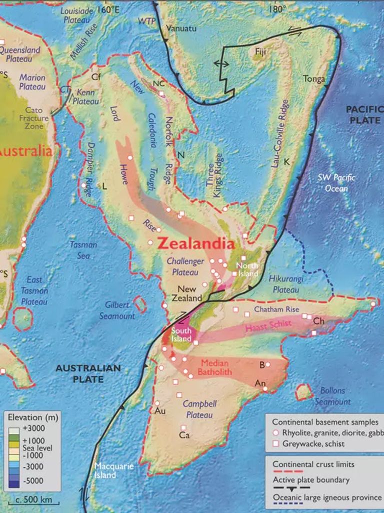وقال مورتيمر إن الجيولوجيين عثروا في فترة مبكرة من القرن السابق على قطع جرانيت من جزر قرب نيوزيلندا وصخور متحولة في كاليدونيا الجديدة تشير إلى جيولوجيا قارية.