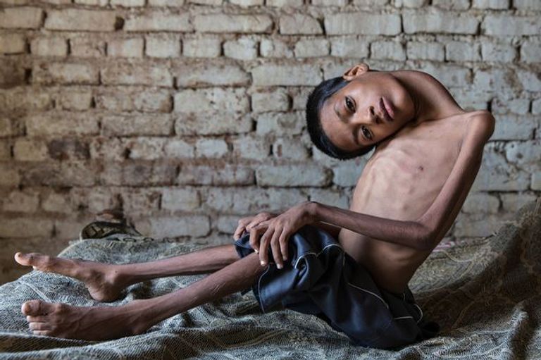 عضلات رقبة الطفل ضعيفة جداً، حيث يتدلى رأسه إلى الجانب بـ 180 درجة، إذ يحتاج للمساعدة في ظل الظروف الصعبة ومشقات الحياة التي تواجه عائلته.
