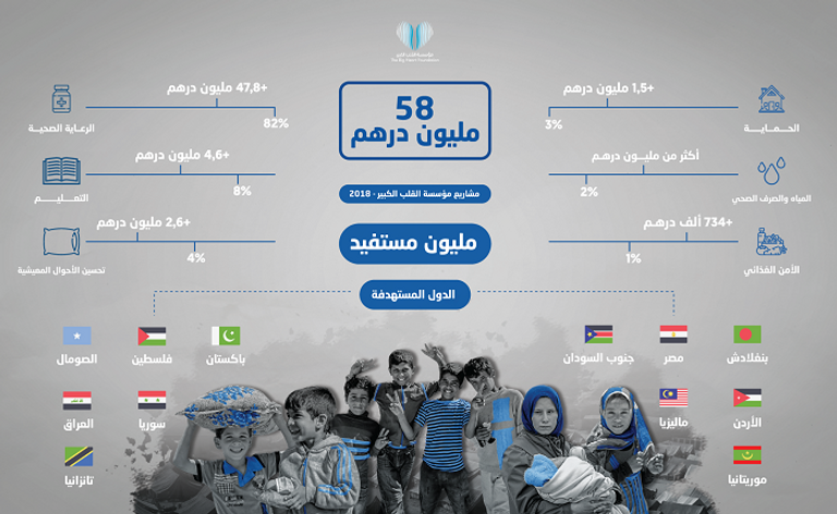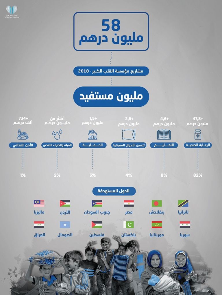 كشفت مؤسسة القلب الكبير الإماراتية، المؤسسة الإنسانية العالمية المعنية بمساعدة اللاجئين والمحتاجين، أن المساعدات التي قدمتها خلال عام 2018 للفقراء واللاجئين حول العالم بلغت 58 مليون درهم، استفاد منها مليون و 91 ألف شخص في 12 دولة تعد من الأكثر تضرراً نتيجة الصراعات والأزمات المختلفة، وتركزت المساعدات على تعزيز القطاعات الحيوية التي تلبي حاجة المجتمعات للتعليم والرعاية الصحية والأمن الغذائي.