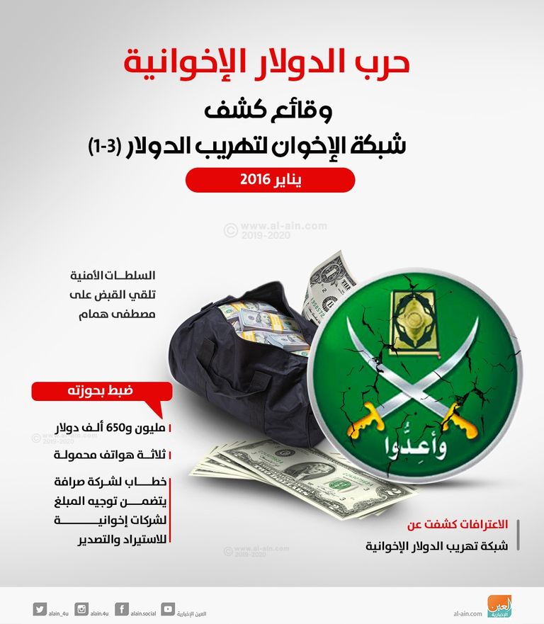 وقال مصدر قضائي مطلع لـ"العين الإخبارية" إن التنظيم الإرهابي نجح في تهريب نحو 160 مليون دولار (الدولار كان يعادل 7.80 جنيه مصري) خارج مصر، في الفترة التي أعقبت ثورة 30 يونيو/حزيران، مشيراً إلى أن البلاد شهدت فترة سيولة ساعدت الجماعة في تنفيذ مخططها.