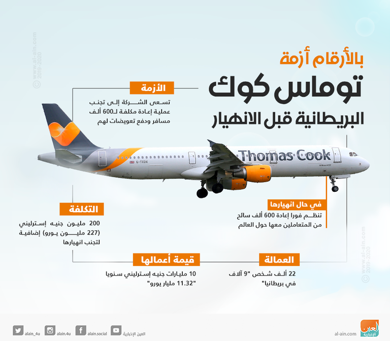 وتسجل توماس كوك وكالة السفر وشركة الطيران رقم أعمال يبلغ نحو 10 مليارات جنيه في العام (11,32 مليار يورو).