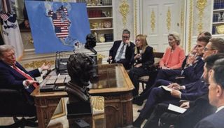 ونشر ترامب صورة، يبدو أنها معدلة بالذكاء الاصطناعي، يظهر فيها وهو جالس مع قادة أوروبيين وبجانبه خريطة للولايات المتحدة تشمل غرينلاند وكندا وفنزويلا.