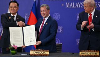 قدّم ترامب نفسه بصفته مهندس "الاتفاق التاريخي" الذي وُقّع في 26 أكتوبر/تشرين الأول الماضي بين البلدين في جنوب شرق آسيا، اللذين يتنازعان منذ فترة طويلة على ترسيم أجزاء من حدودهما المشتركة الممتدة 800 كيلومتر التي تعود إلى الحقبة الاستعمارية الفرنسية.