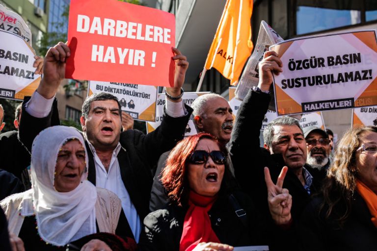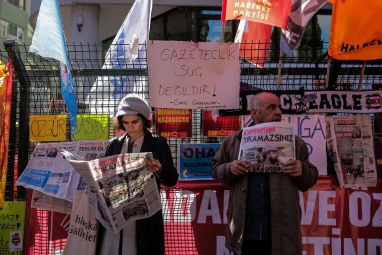 ورفع المتظاهرون لافتات كتب على إحداها "لن نستسلم" وكانت العبارة عنوانا أيضا في صحيفة جمهوريت العلمانية التي ألقي القبض على رئيس تحريرها ومسؤولي التحرير بها هذا الأسبوع بتهمة نشر مقالات عجلت بمحاولة الانقلاب.