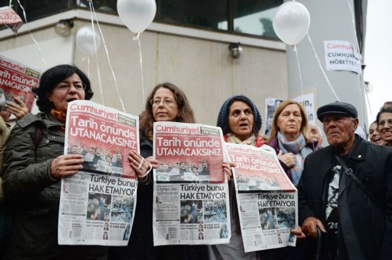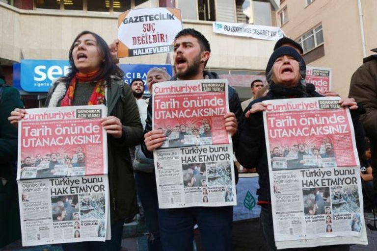 واليوم السبت، أمرت السلطات التركية باعتقال 9 صحفيين ومدراء تنفيذيين في الصحيفة، من بينهم عدد من أبرز الصحفيين في تركيا، مثل رئيس تحريرها مراد سابونجو، والكاتب الصحفي المناهض لأردوغان قدري غورسيل، ورسام الكاريكاتير موسى كارت.