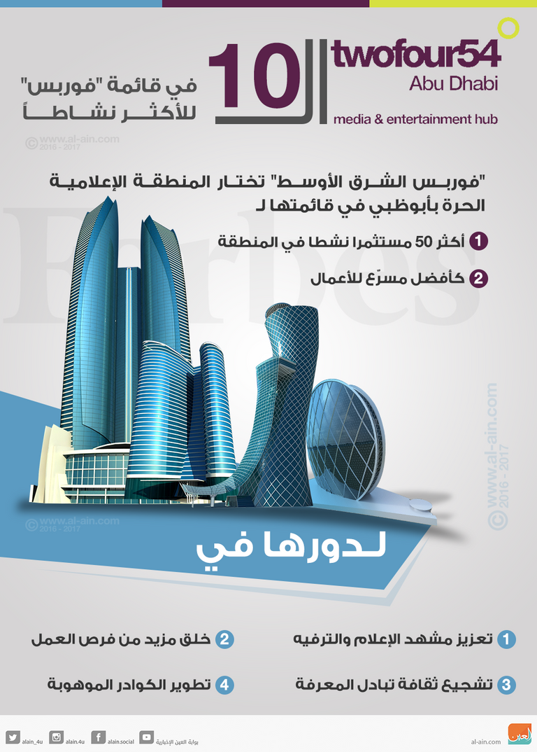 حلّت "twofour54" المنطقة الحرة الرائدة للإعلام والترفيه في العاصمة الإماراتية أبوظبي، في المرتبة الـ10 ضمن قائمة أكثر 50 مستثمراً نشطاً في المنطقة الصادرة عن مجلّة فوربس الشرق الأوسط، كما جاءت في المرتبة الثانية كأفضل مسرّع للأعمال.