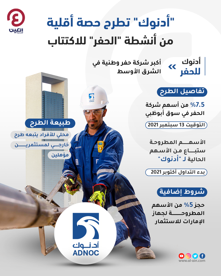 أعلنت شركة بترول أبوظبي الوطنية "أدنوك" عن عزمها طرح حصة 7.5% في أسهم شركة "أدنوك للحفر" للاكتتاب العام في سوق أبوظبي للأوراق المالية.