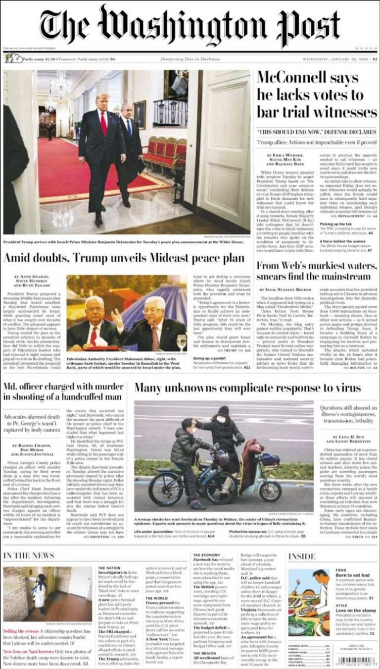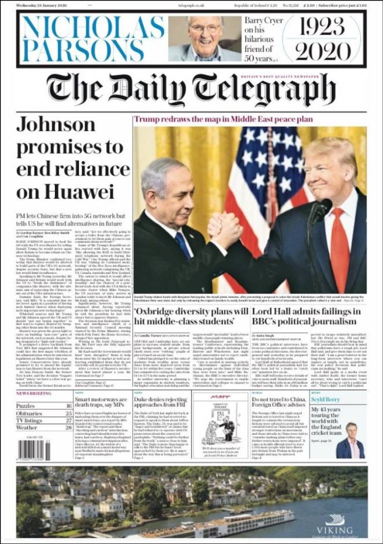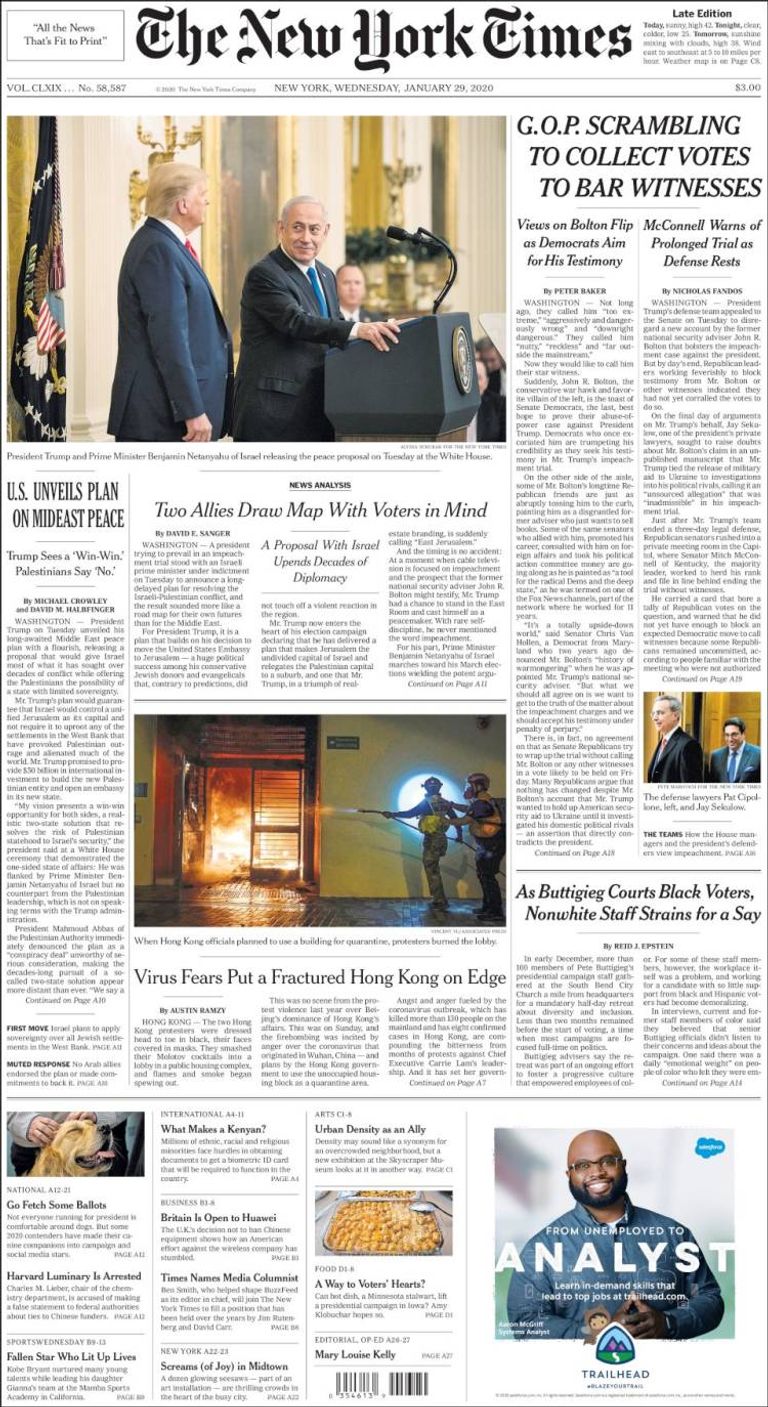 تصدر الإعلان عن "صفقة القرن" العناوين الرئيسية وأغلفة الصحف العالمية الصادرة، الأربعاء، التي قالت إن الرئيس الأمريكي دونالد ترامب كشف النقاب عن خطة طال انتظارها للسلام بين الفلسطينيين والإسرائيليين.