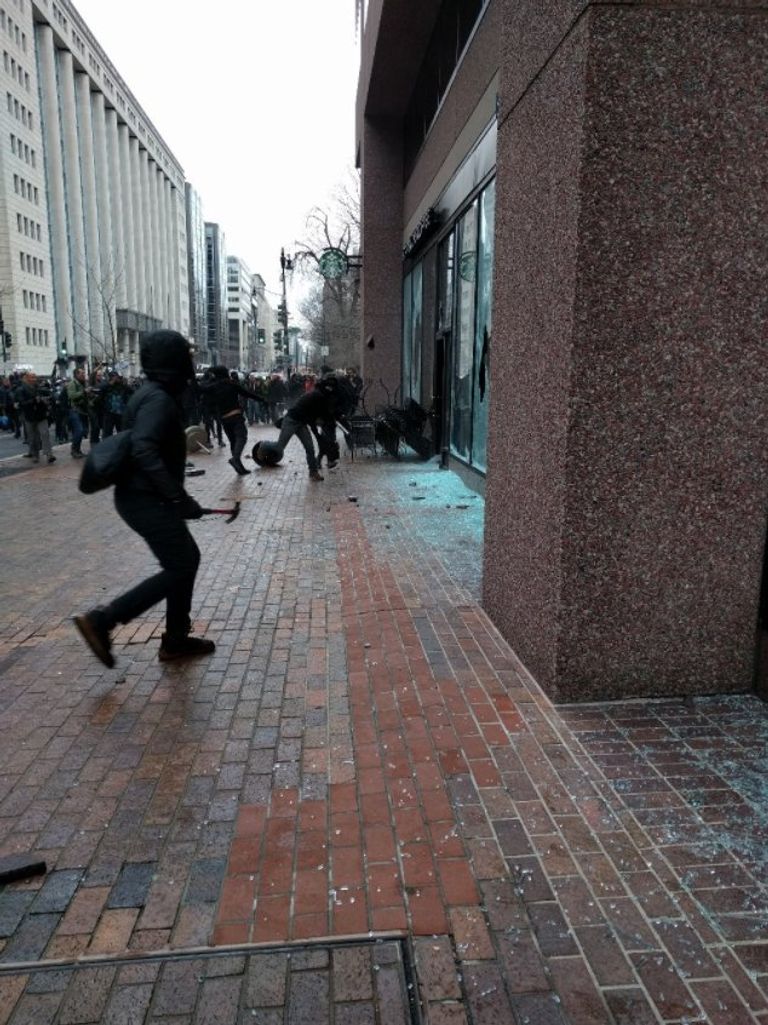 مجموعة من المحتجين المتشحين بالسواد والمعارضين لتنصيب الجمهوري دونالد ترامب رئيسا للولايات المتحدة يحطمون واجهات متاجر.