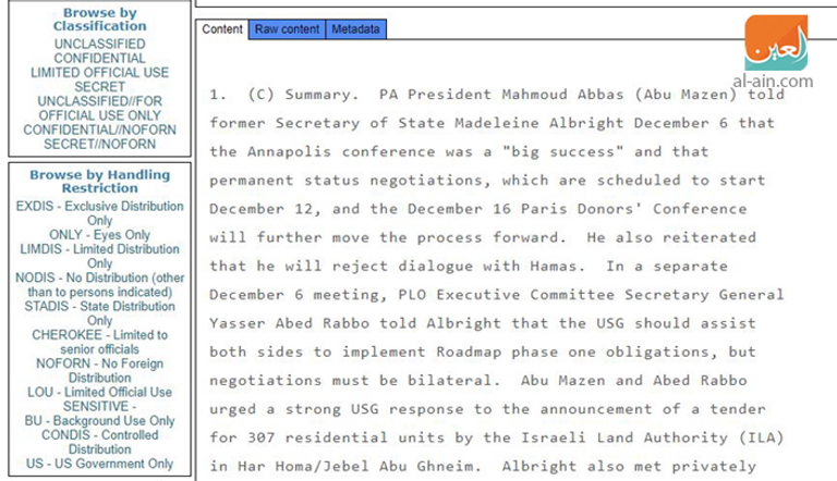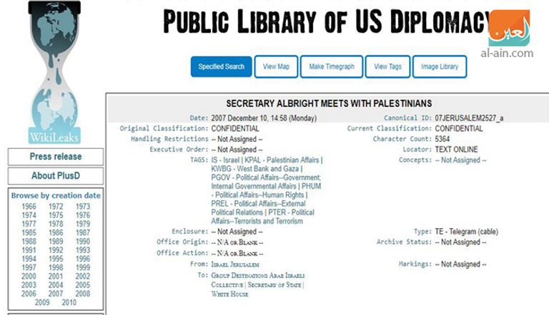 وفي برقية سرية أخرى يوم 10 ديسمبر/كانون أول 2007، كتب القنصل الأمريكي العام في القدس جاكوب والاص، عن نتائج لقاء الرئيس الفلسطيني محمود عباس مع وزيرة الخارجية الأمريكية السابقة مادلين أولبرايت في رام الله "حماس تتمكن من البقاء، أساسا، بسبب التمويل القطري".