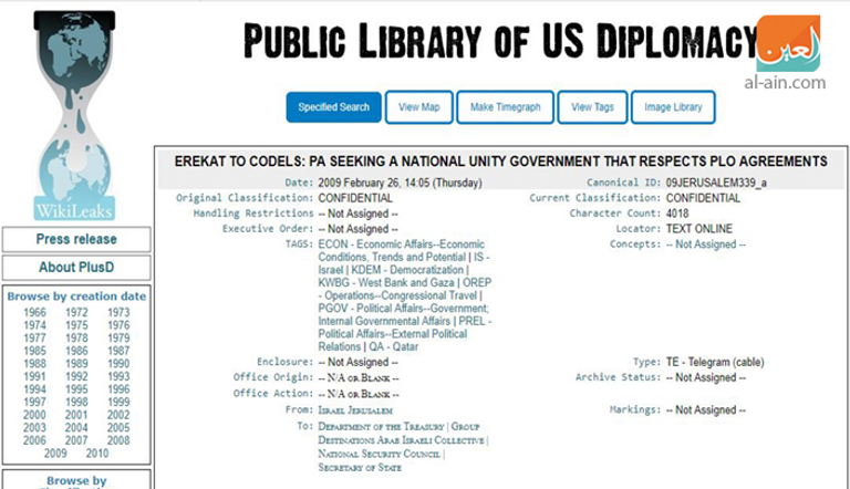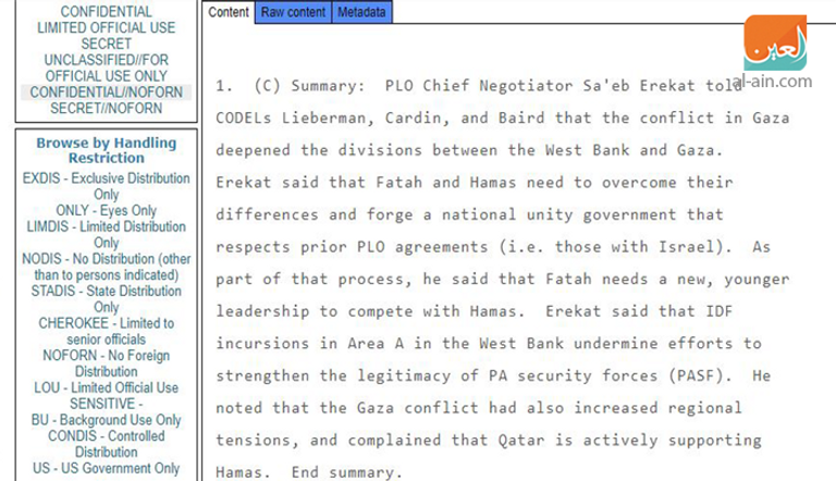 فيما اشتكى أمين سر اللجنة التنفيذية لمنظمة التحرير الفلسطينية صائب عريقات، من الدعم القطري الفاعل لحركة حماس؛ حيث كشفت برقية سرية كتبها "والاص" في 26 فبراير/شباط 2009 واطلعت عليها بوابة "العين" الإخبارية، عن لقاء الأول بعدد من أعضاء الكونجرس، في رام الله.