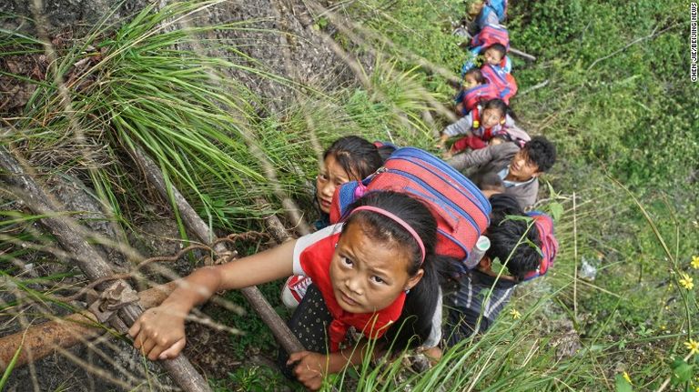 في جبال مقاطعة سيتشوان جنوب غرب الصين، يجب على مجموعة من الأطفال أن تهبط في جرف أو مسار جبلي مخيف طوله 800 متر (نصف ميل) حتى يصلوا إلى مدرستهم.