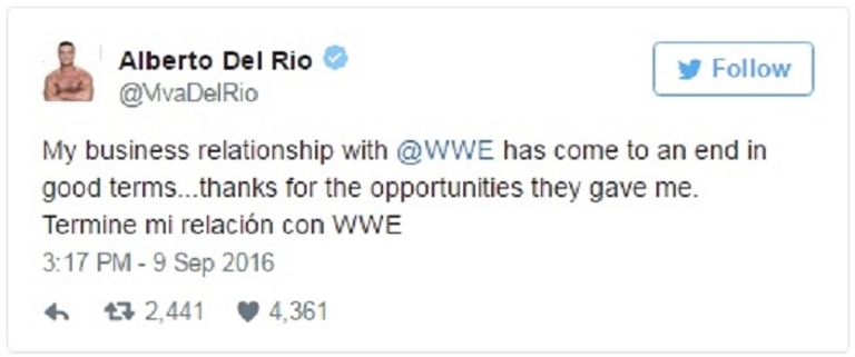 وكان ألبرتو ديل ريو قد أبلغ مؤسسة WWE عن طريق المحامين بأنه ينسحب من عقده الحالي معها، وتم التوصل إلى اتفاق بين الطرفين، وقد أطلق ديل ريو بعد الاستغناء عن خدماته تغريدة على حسابه الشخصي على موقع التواصل الاجتماعي "تويتر" جاء فيها: "عملي مع مؤسسة WWE وصل إلى النهاية بشروط جيدة.. أشكر المؤسسة على الفرص التي أتاحتها لي".