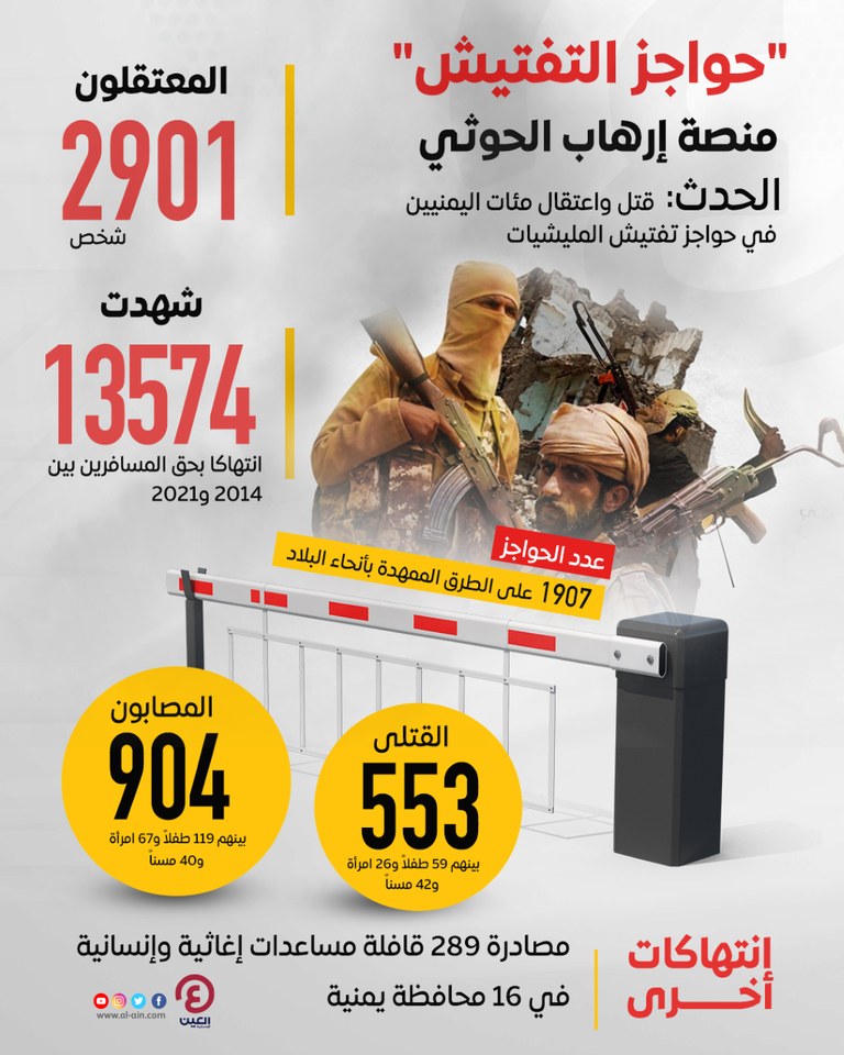 وسجل التقرير المعنون بـ "نقاط الموت" تعرض 1952 مدنيا للقتل والإصابة في حواجز التفتيش غالبيتهم ارتكبتها مليشيات الحوثي الإرهابية، حيث تنوعت الانتهاكات بين الجسدي والاختطاف والإخفاء القسري والتعذيب.