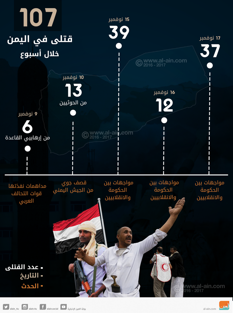 بوابة العين الإخبارية، أعدت إنفوجراف يرصد مقتل 107 أشخاص في اليمن خلال أسبوع