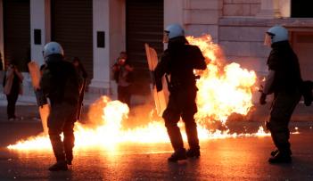 الشرطة اليونانية أطلقت قنابل الغاز المسيل للدموع، خلال احتجاج خارج البرلمان بوسط أثينا، مساء الأحد