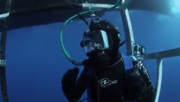 استغل رجل شجاع وجوده مع صديقته في قبالة سواحل جزيرة غوادالوبي بالمكسيك، ليطلب منها الزواج، حيث تسبح أسماك القرش حولهما بعمق 30 قدماً.