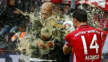 الإسباني تشابي ألونسو لاعب بايرن ميونخ يغرق مواطنه بيب جوارديولا مدرب الفريق بالمشروبات الغازية احتفالا بالتتويج بلقب البوندسليجا.