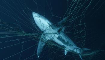 من زورقه المطاطي يشير رائد الغوص مع أسماك القرش والتر برنارديس إلى شبكة أقيمت تحت الماء لحماية السباحين من هجمات الأسماك المفترسة.
