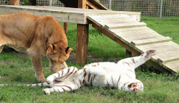 صور جميلة للعلاقة القوية والغريبة التي جمعت بين الأسد "كاميرون" والنمر "زابو" بعد أن تم إنقاذهما من حديقة حيوانات عام 2004