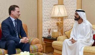 الشيخ محمد بن راشد آل مكتوم نائب رئيس الإمارات رئيس مجلس الوزراء حاكم دبي يستقبل بيير كرينبول المفوض العام لوكالة الأمم المتحدة.
