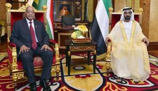 الشيخ محمد بن راشد آل مكتوم، نائب رئيس الدولة رئيس مجلس الوزراء حاكم دبي، يستقبل الرئيس جاكوب زوما، رئيس جمهورية جنوب أفريقيا