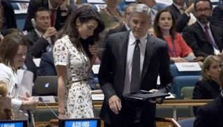 جورج كلوني ظهر بكامل لياقته أثناء توجههه لتناول العشاء مع زوجته أمل علم الدين بعد الحادث الذي تعرض له في إيطاليا وعقب شائعة طلاقهما