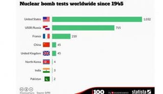 أجرت 8 دول أكبر عدد من التجارب النووية، منذ عام 1945، بإجمالي 2056 تجربة وكان في صدارتها أمريكا، حسب تقرير لمعهد "ستوكهولم".