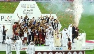 عبدالله النابودة، رئيس مجلس إدارة النادي الأهلي الإماراتي، يهنئ نادي الوحدة عقب فوزه لأول مرة بكأس الخليج العربي.