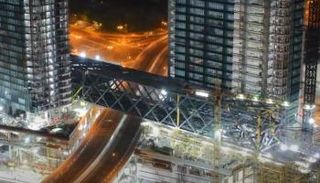 أصبح المبنى جاهزا ليتم رفعه 100 متر فوق سطح الأرض ويأخذ شكله النهائي بعد إضافة منصة ناتئة سيعلن عن طولها لاحقا.