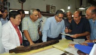 رفع قطعة خشبية أثرية من مركب الملك خوفو الثانية التي تم اكتشافها منتصف القرن الماضي على يد الأثري كمال الملاخ.