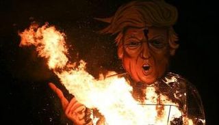 سكان بلدة إدنبريدج جنوبي العاصمة البريطانية لندن يحرقون دمية للمرشح الجمهوري في انتخابات الرئاسية الأمريكية دونالد ترامب.