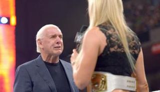 ريك فلير والد تشارلوت بطلة WWE للسيدات تحدث إليها أمام الجمهور في عرض "رو" ليهنئها بالاحتفاظ بالبطولة لكن الجميع فوجئ بها تقوم بطرده.