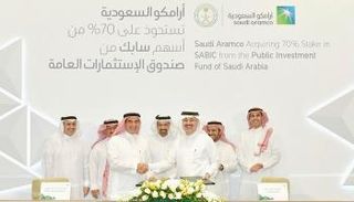 "أرامكو" تعقد صفقة مع صندوق الاستثمارات العامة السعودي للاستحواذ على 70% من أسهم "سابك" بسعر 123.39 ريال للسهم الواحد.