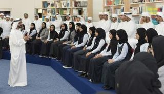 مجلس وزراء الإمارات برئاسة الشيخ محمد بن راشد آل مكتوم، يعقد جلسة بمدرسة فاطمة بنت مبارك في رأس الخيمة، بحضور مجموعة من الطلاب الأوائل