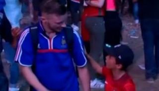 طفل مشجع للمنتخب البرتغالي يقوم بمواساة مشجع للمنتخب الفرنسي كان يبكي بعد خسارة نهائي بطولة يورو 2016 التي أقيمت في فرنسا.