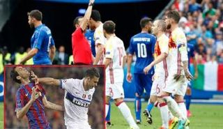 تياجو موتا لاعب إيطاليا يرد الدين لنظيره الإسباني سيرخيو بوسكيتس باحتكاك بينهما في مباراة المنتخبين ببطولة يورو 2016