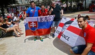 جماهير إنجلترا وسلوفاكيا تختلط في أجواء سلمية بمدينة سانت إتيان الفرنسية، قبل مواجهة المنتخبين اليوم ببطولة أمم أوروبا.