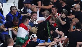 الجماهير المجرية تشتبك مع قوات الشرطة الفرنسية داخل استاد مارسيليا السبت قبل مباراة أيسلندا والمجر، ببطولة أوروبا 2016.