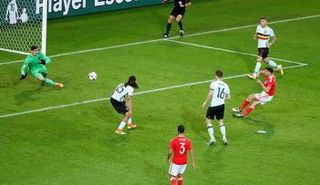 أشلي ويليامز، قائد ويلز، يستغل غفلة وسرحان دفاع منتخب بلجيكا ليسجل هدف التعادل لمنتخب بلاده في مواجهة الفريقين في ربع النهائي اليورو.
