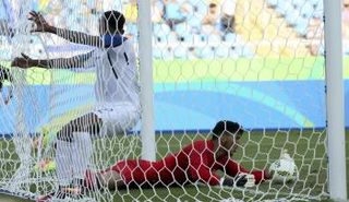 فريد شعال حارس مرمى المنتخب الجزائري الأوليمبي يرتكب خطأ فادحًا في مواجهة المنتخب الهندوراسي ويكلف بلاده هدفًا.