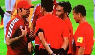 مهدي علي مدرب منتخب الإمارات ينفعل على الحكم الماليزي الذي يدير مباراة الأبيض وأستراليا في تصفيات كأس العالم.. ما السبب؟